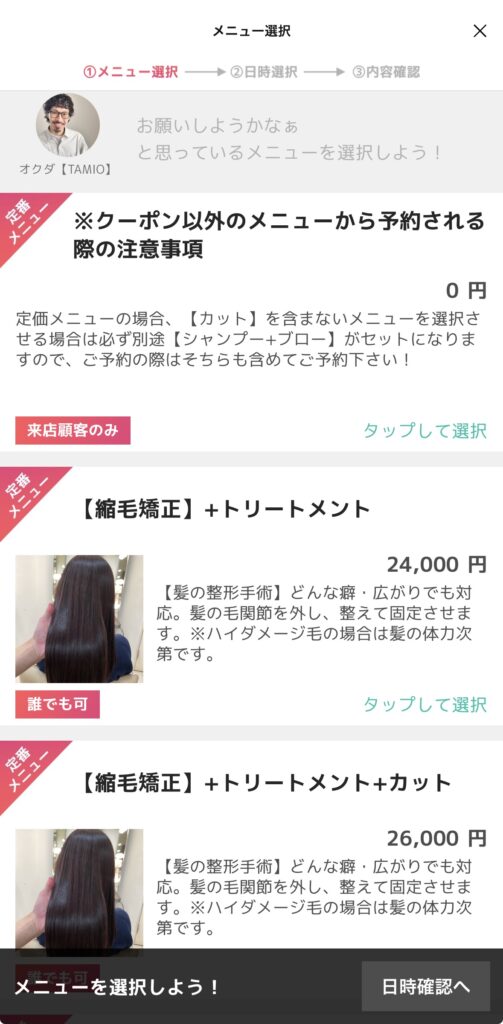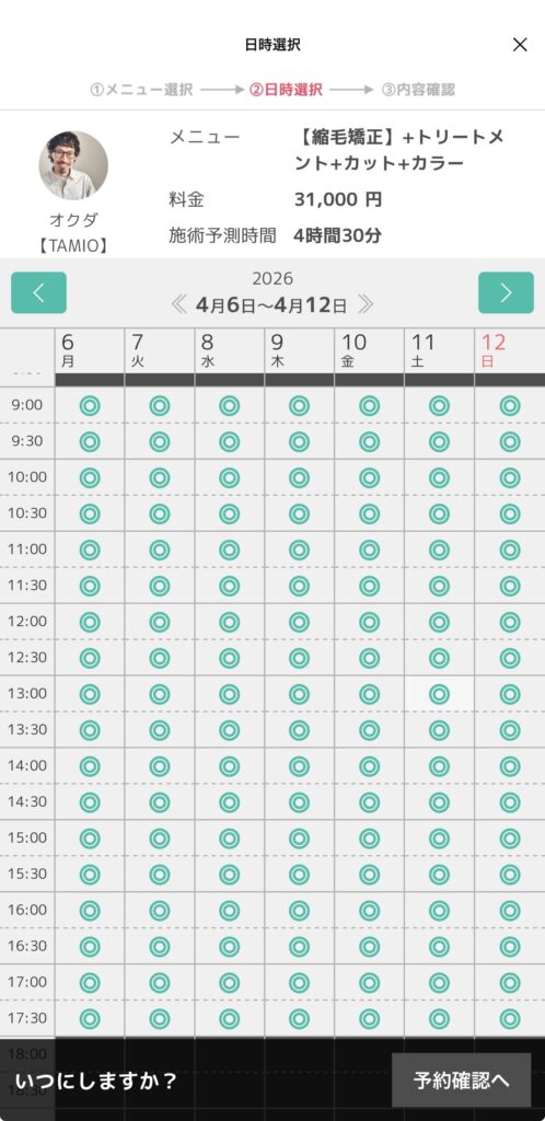 ❻選択されたメニュー時間に合わせて、ご予約可能な枠に◎二重丸が表示されますのでご都合の良い時間をお選びください。