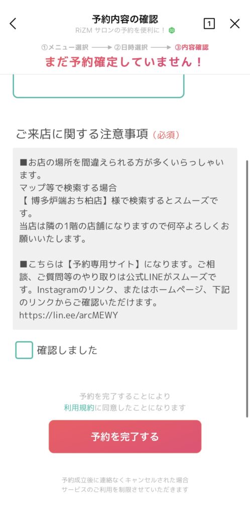 ❼最後に注意事項が出てきます。内容をご確認の上「確認ボタンにチェック」いただき「予約を完了する」を押してください。