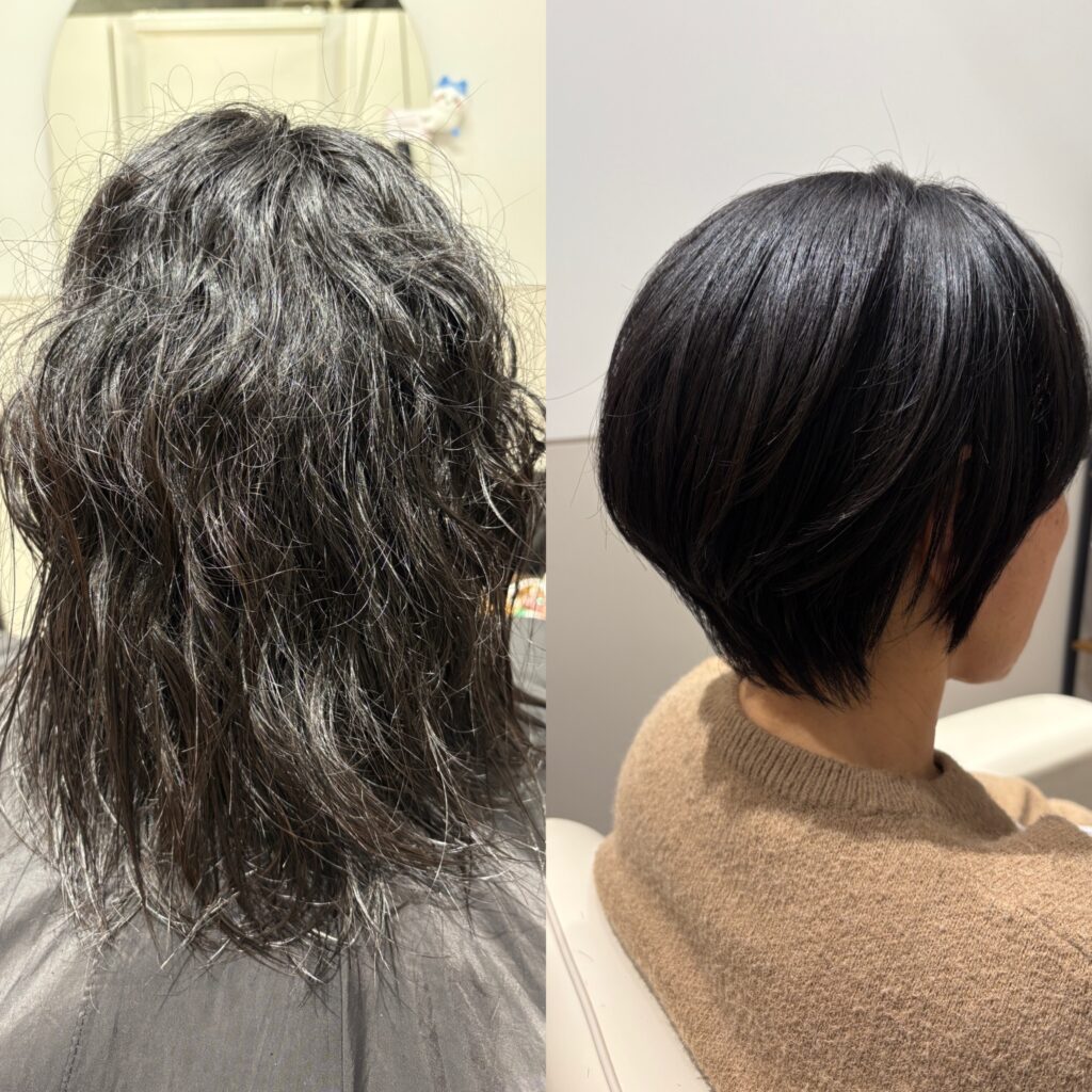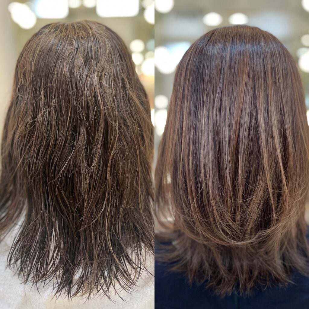 【仕上がり】髪の毛にまとまりがなく疲れて見えてしまっていました。縮毛矯正によって艶が出たことで若返って見えるようになりました。