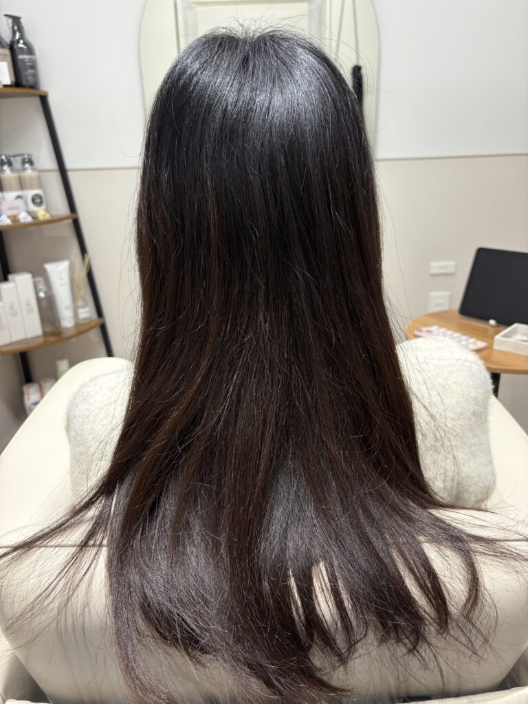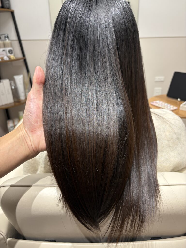 ですので髪に少しの負荷をかけた上で、トリートメントの効果で補強し艶を出していきます。